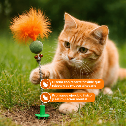 Su base firme permite colocarlo en tierra, césped o superficies blandas, ofreciendo estabilidad mientras el resorte genera un movimiento dinámico e impredecible que motiva al gato a jugar repetidamente.