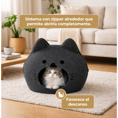 Gracias a su tamaño es ideal para gatos medianos y grandes que necesitan mayor amplitud sin perder la sensación de refugio. El cierre con zipper facilita la limpieza y permite abrirla completamente si desea usarla como camita abierta. Una opción práctica, estética y funcional para que su gato tenga su propio rincón de descanso.