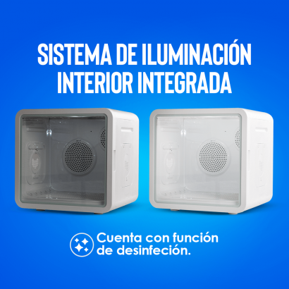 La secadora inteligente para mascotas de 76L ofrece un espacio amplio y cómodo ideal para gatos grandes o perros pequeños, garantizando un secado uniforme gracias a su flujo de aire 360° que alcanza incluso zonas difíciles como abdomen y patas. Funciona con un sistema ultra silencioso de 40 dB e incorpora música relajante para reducir el estrés durante el proceso. Puede controlarse desde su panel táctil o mediante APP, permitiendo ajustar temperatura (22° a 45°C), temporizador, velocidad de aire, iluminación y activar sus distintos modos inteligentes según la necesidad de su mascota. Su sistema de ventilación dual renueva constantemente el aire e integra más de 10 millones de iones negativos que dejan el pelaje suave, brillante y sin estática. Además, cuenta con protección avanzada contra sobrecalentamiento para brindar una experiencia de secado segura, estable y confortable.