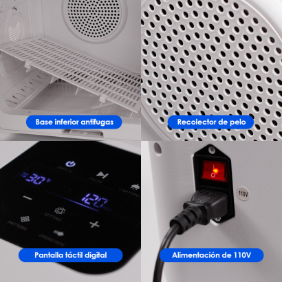 ✅5 modos inteligentes, temperatura ajustable (22°–45°C), temporizador, velocidad de aire, luces y seguro infantil.